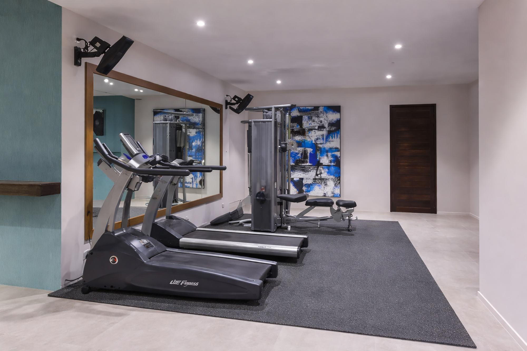 Lighting layers: Bright, high-CRI overheads for training, warm accents for cooldowns.